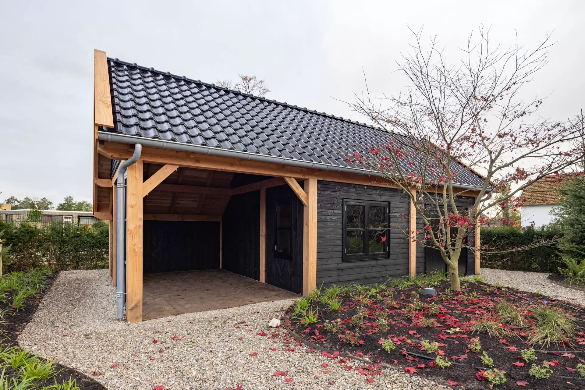 Een robuuste kapschuur op maat. Precies zoals je wenst. Gelegen in Leersum. Vanuit de wensen van de klant zijn ze klaar om jarenlang vorstelijk te genieten. Combineer het praktische karakter van een kapschuur met comfort. Genoeg plaats om spullen op te bergen. En nóg meer ruimte om te doen waar het leven om gaat: genieten!